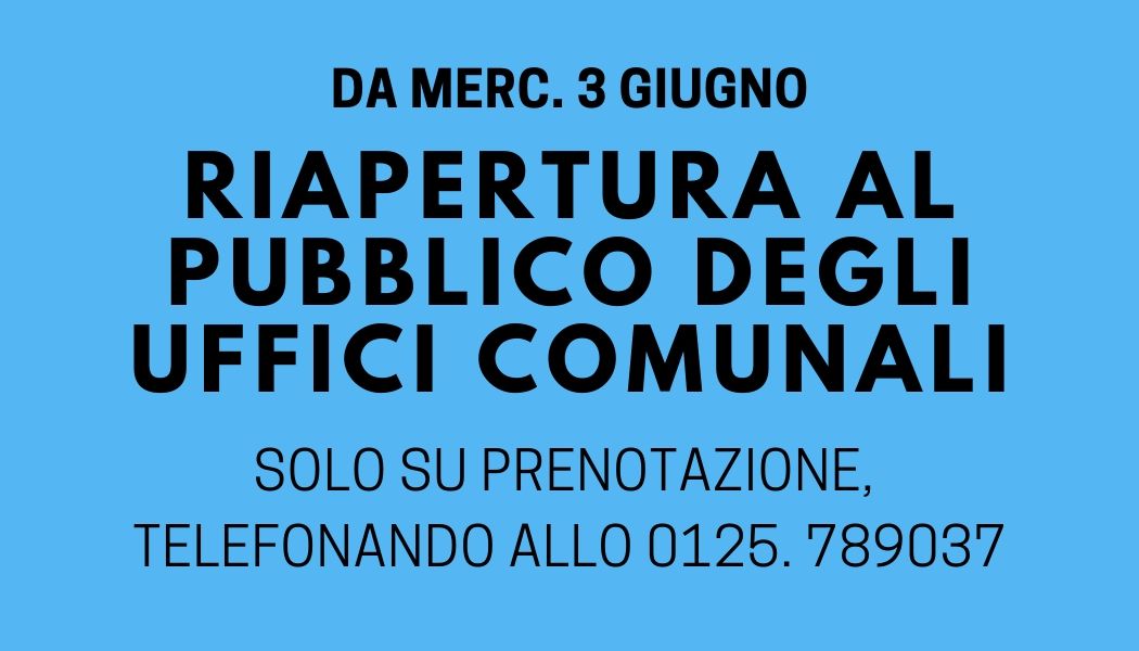 Da merc. 3 giugno sarà possibile accedere fisicamente agli uffici comunali. L’accesso sarà consentito ad una sola persona alla volta, dal lunedì al venerdì mattina, previa prenotazione telefonica allo 0125.789037, oppure tramite email.
