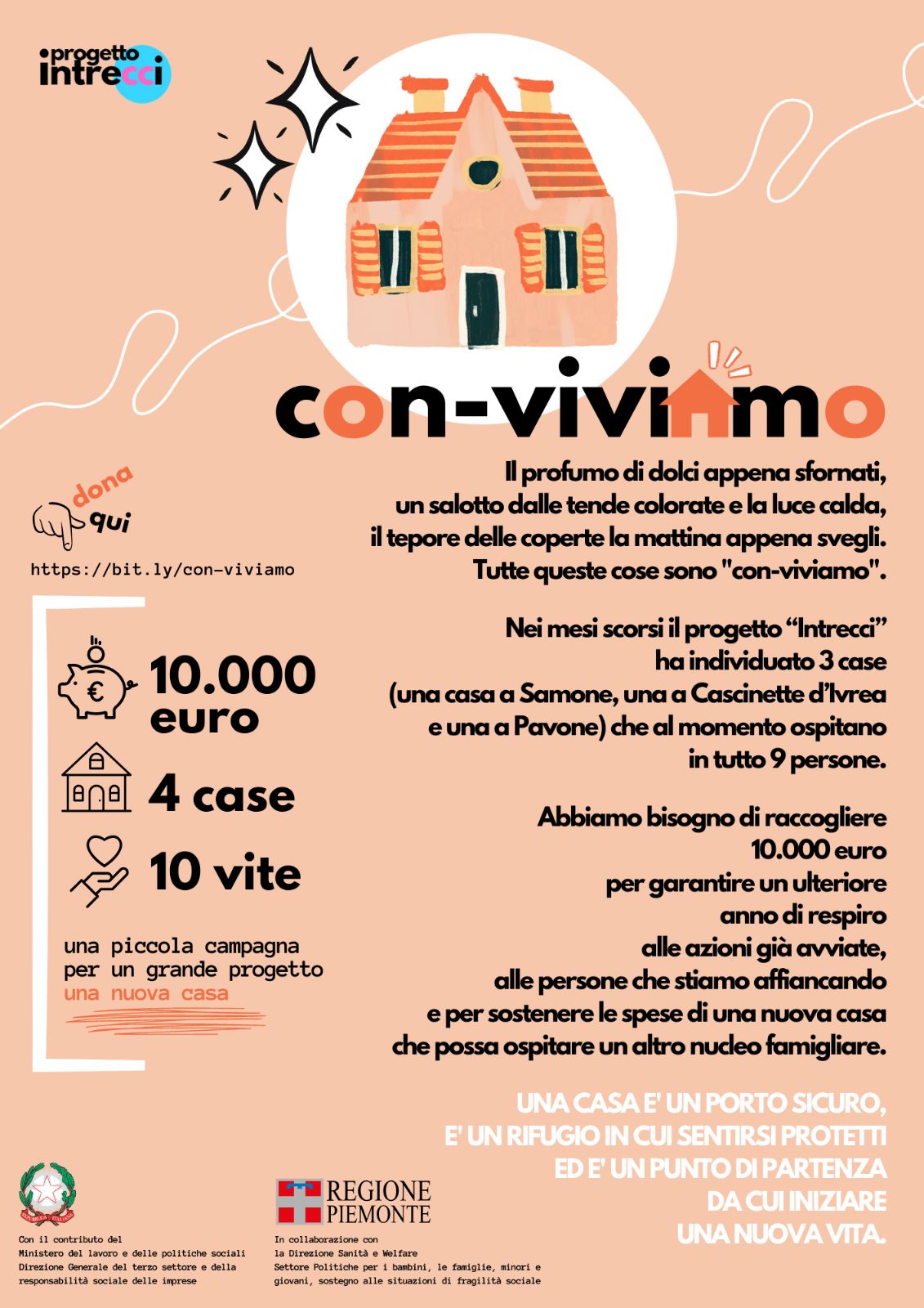 Percorsi di inclusione e solidarietà” promuove la raccolta fondi "CON-VIVIAMO", un'iniziativa che vuole farsi carico del FENOMENO DELL’EMERGENZA ABITATIVA individuando case e alloggi nei Comuni canavesani da mettere a disposizione di nuclei famigliari in difficoltà, supportandoli nella gestione economica dell’affitto, delle spese e dell’arredo. I beneficiari del progetto verranno inoltre affiancati con interventi definiti di "accompagnamento leggero", con l'obiettivo di individuare, sostenere e valorizzare le risorse personali di ognuno. In questo modo si faciliteranno percorsi di autonomia e di attivazione di gruppi di auto-mutuo-aiuto capaci di creare opportunità di scambio e di socialità.