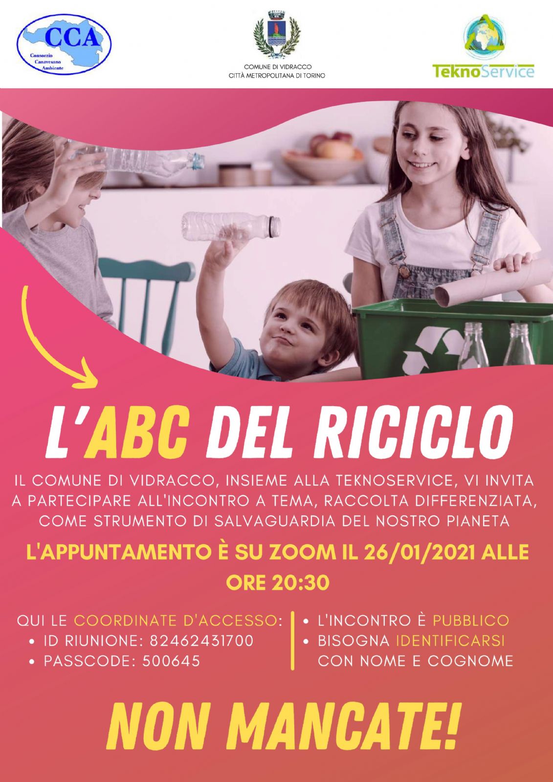 Il Comune di Vidracco insieme alla Teknoservice, Vi invita martedì 26 gennaio all'incontro a tema Raccolta differenziata come strumento di salvaguardia del nostro pianeta. Vi aspettiamo nel salone virtuale, via zoom alle ore 20,30.